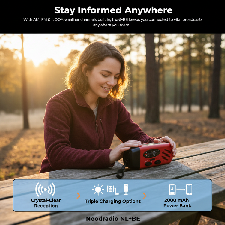 Discover the Noodradio NL+BE's compact design fitted with AM, FM & NOAA weather channels to keep you connected. Its powerful 2000mAh battery doubles as a power bank and recharges via hand crank, solar panel or USB. Plus, bright LED flashlights and status indicators ensure readiness in any situation.